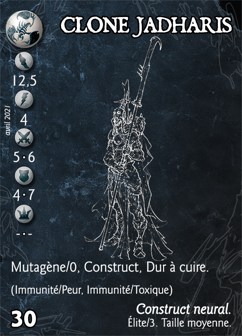 Après avoir constaté qu’à l’exemple de Cypher Lukhan et de Sasia Samaris, certains clones pouvaient développer une personnalité et se poser des questions néfastes à leur complète obéissance, Jadharis, technomancien de Shamir, a mis au point une série de prototypes portant son nom. Ces guerriers biomécaniques sont actuellement soumis à des tests en conditions réelles. Certains maîtres de Shamir rêvent de voir ces créatures supplanter les encombrants officiers des régiments partis en terre étrangère...