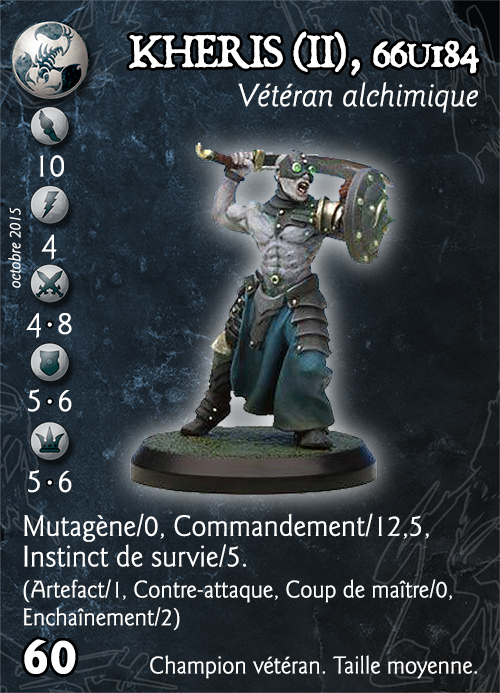 Kheris est une valeur sûre pour toute compagnie du Scorpion. Une valeur stratégique modeste (135 P.A.) et un vaste choix dans les unités d´accueil (n´importe quelle unité de Rang 1) lui permettent de rejoindre facilement toutes les compagnies du Scorpion. S´il ne se distingue pas par des caractéristiques de combat exceptionnelles, il reste néanmoins un Incarné et bénéficie à ce titre d´avantages hors du commun.