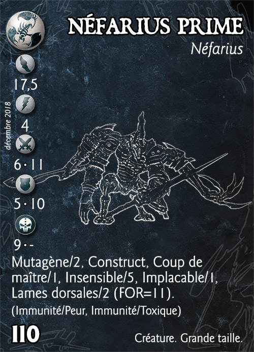 Compétences : Mutagène/2, Construct, Coup de maître/1, Insensible/5, Implacable/1, Lames dorsales/2 (FOR=11). (Immunité/Peur, Immunité/Toxique).