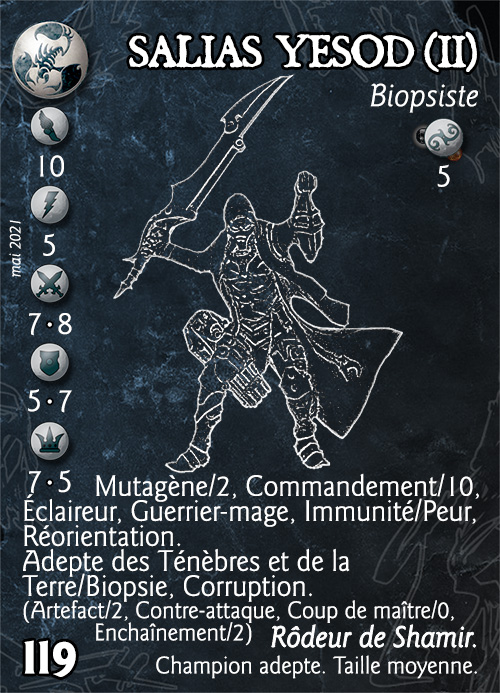 Compétences : Mutagène/2, Commandement/10, Éclaireur, Guerrier-mage, Immunité/Peur, Réorientation. Adepte des Ténèbres et de la Terre/Biopsie, Corruption. (Artefact/2, Contre-attaque, Coup de maître/0, Enchaînement/2).