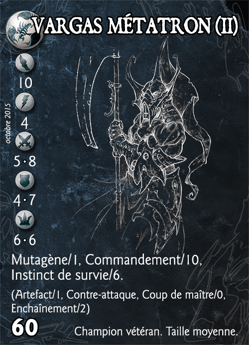 Compétences : Mutagène/1, Commandement/10, Instinct de survie/6. (Artefact/1, Contre-attaque, Coup de maître/0, Enchaînement/2).