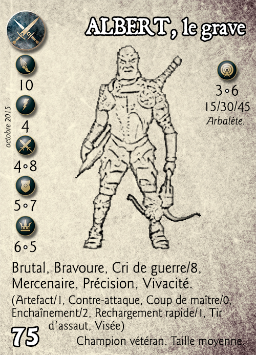 Compétences : Brutal, Bravoure, Cri de guerre/8, Mercenaire, Précision, Vivacité. (Artefact/1, Contre-attaque, Coup de maître/0, Enchaînement/2, Rechargement rapide/1, Tir d'assaut, Visée)