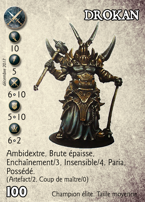 Compétences : Ambidextre, Brute épaisse, Enchaînement/3, Insensible/4, Paria, Possédé. (Artefact/2, Coup de maître/0).