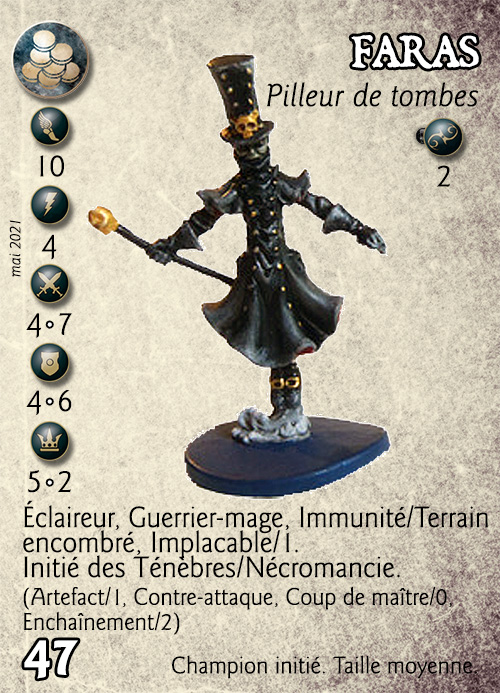 Compétences : Éclaireur, Guerrier-mage, Immunité/Terrain encombré, Implacable/1. Initié des Ténèbres/Nécromancie. (Artefact/1, Contre-attaque, Coup de maître/0, Enchaînement/2).