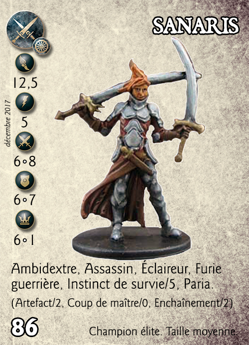 Compétences : Ambidextre, Assassin, Éclaireur, Furie guerrière, Instinct de survie/5, Paria. (Artefact/2, Coup de maître/0, Enchaînement/2).