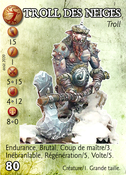 Compétences : Endurance, Brutal, Coup de maître/3, Inébranlable, Régénération/5, Volte/5.