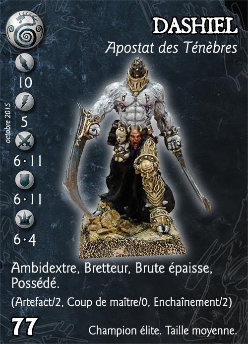 Compétences : Ambidextre, Bretteur, Brute épaisse, Possédé. (Artefact/2, Coup de maître/0, Enchaînement/2).