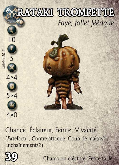 Compétences : Chance, Éclaireur, Feinte, Vivacité. (Artefact/1, Contre-attaque, Coup de maître/0, Enchaînement/2).
