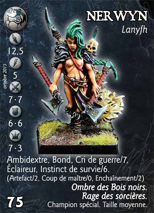 Ombre des Bois noirs. Les lanyfhs dans un rayon de 15cm autour de Nerwyn peuvent utiliser son Courage et sa Discipline comme si elle bénéficiait de la compétence « Commandement/15 ». Nerwyn ne bénéficie cependant pas des effets de cette compétence.