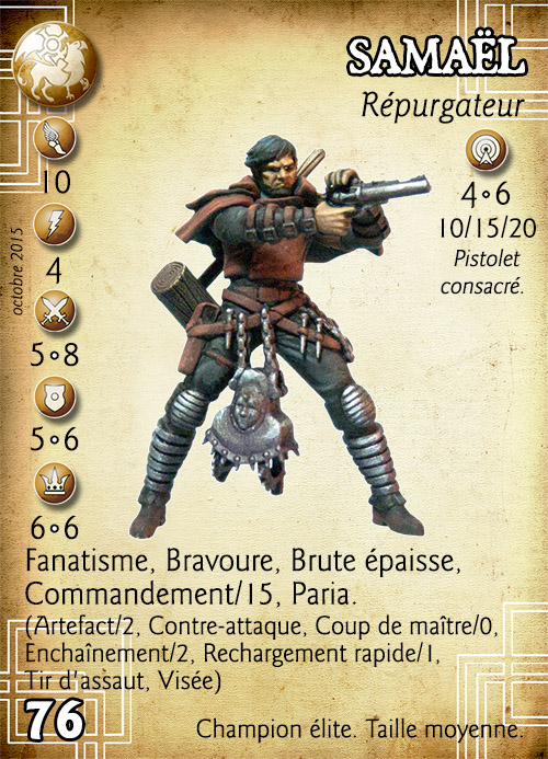 Compétences : Fanatisme, Bravoure, Brute épaisse, Commandement/15, Paria. (Artefact/2, Contre-attaque, Coup de maître/0, Enchaînement/2, Rechargement rapide/1, Tir d'assaut, Visée)