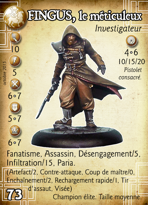 Compétences : Fanatisme, Assassin, Désengagement/5, Infiltration/15, Paria. (Artefact/2, Contre-attaque, Coup de maître/0, Enchaînement/2, Rechargement rapide/1, Tir d'assaut, Visée)