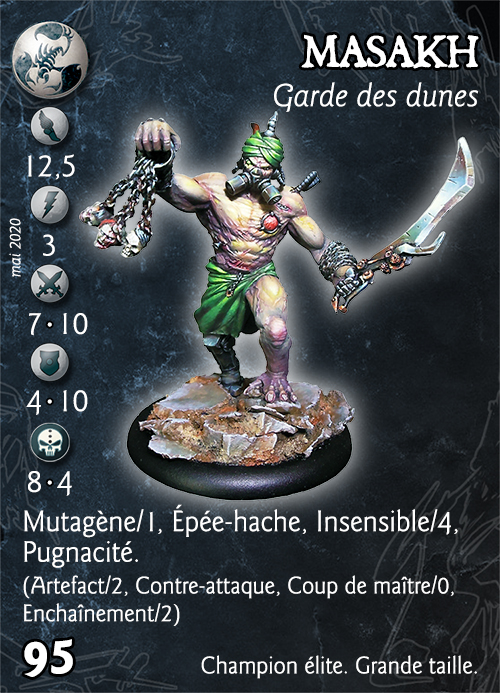 Masakh est certainement l'un plus célèbres clones de Tarsith. Avec son respirateur Gemilli unique, véritable prouesse technologique du laboratoire de Tarsith, parfait pour d'une part filtrer le sable durant les plus violentes tempêtes de sable, et d'autre part faciliter l'adjonction d'un gaz mutagène boostant ses capacités au combat.