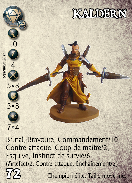 Compétences : Brutal, Bravoure, Commandement/10, Contre-attaque, Coup de maître/2, Esquive, Instinct de survie/6. (Artefact/2, Contre-attaque, Enchaînement/2)